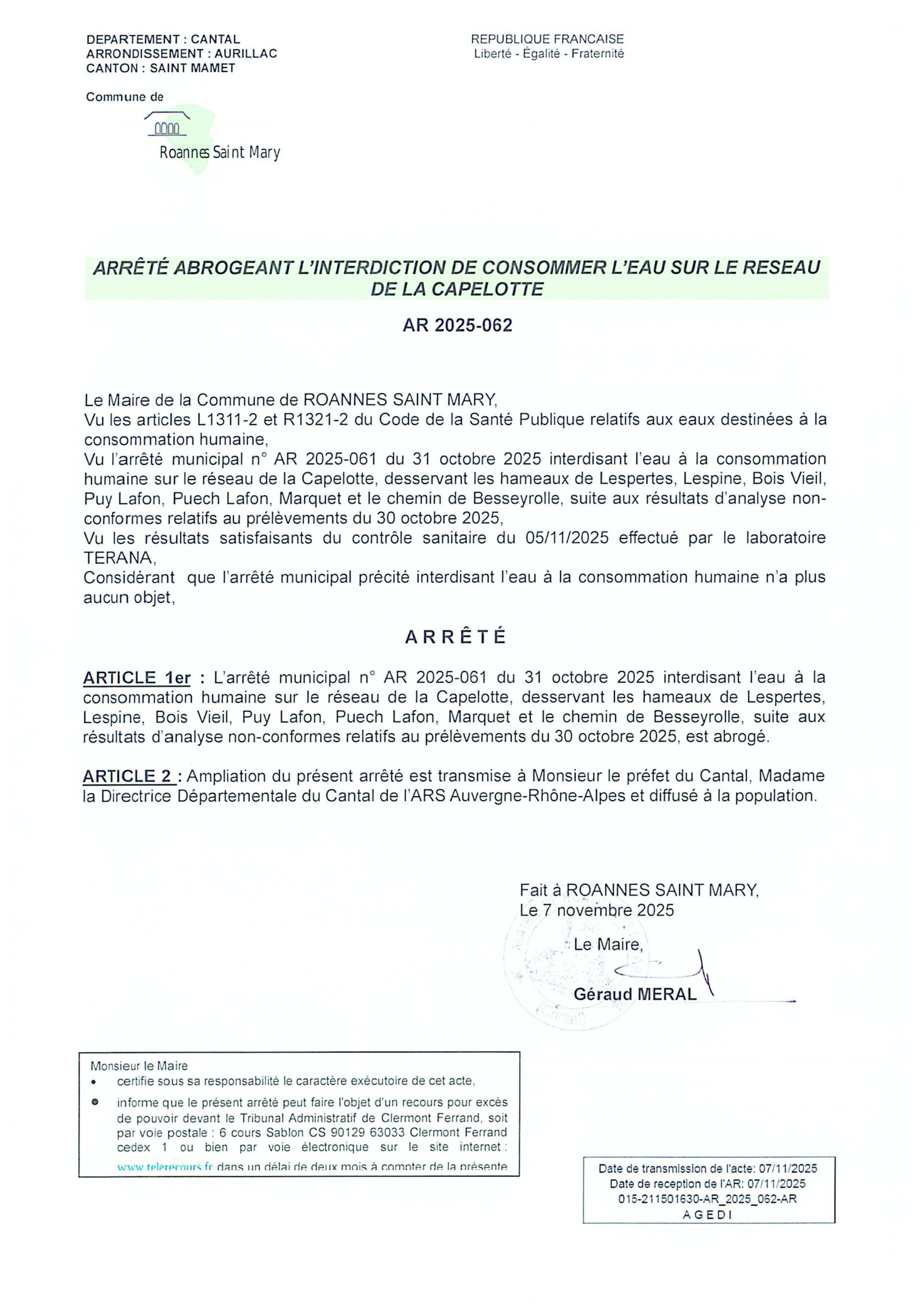 ARRÊTÉ ABROGEANT L'INTERDICTION DE CONSOMMER L’EAU DELA CAPELOTTELien : Arrêté 2025 062 ![]() NOUVEAUTE GARDERIE CANTINEA partir de la rentrée de septembre 2025, les tickets disparaissent. Le paiement se fera par facturation à l'acte lors de chaque période de vacances scolaires. (Infos complémentaires aux familles dès la rentrée) Arrêté N°2025-1677 portant abrogation de limitation provisoire des usages de l'eau dans le departement du cantal. Lien :Arrêté N° 2025-1677 abrogation de limitation provisoire des usages de l'eau | 107e anniversaire de l’Armistice de 1918, mardi 11 novembre 2025 à 11h00. |