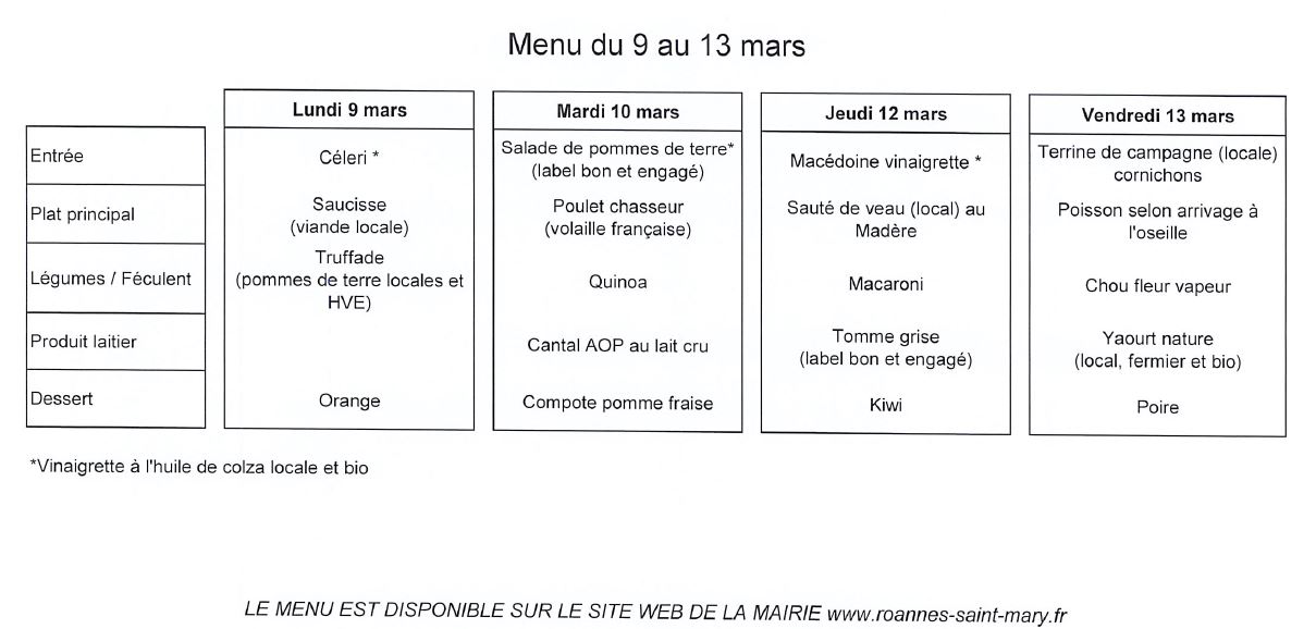 MENU DE LA CANTINE du 9 au 13 mars 2026