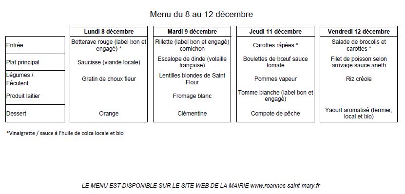 MENU DE LA CANTINE du 8 au 12 décembre 2025
