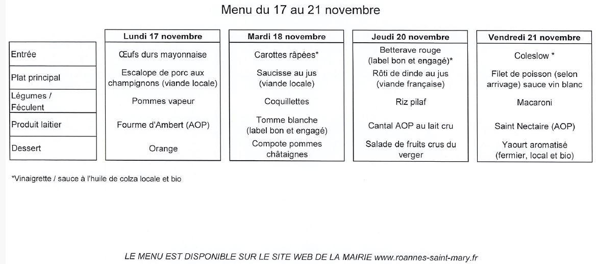 MENU DE LA CANTINE du 17au 21 novembre 2025