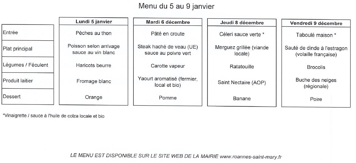 MENU DE LA CANTINE du 5 au 9 janvier 2026
