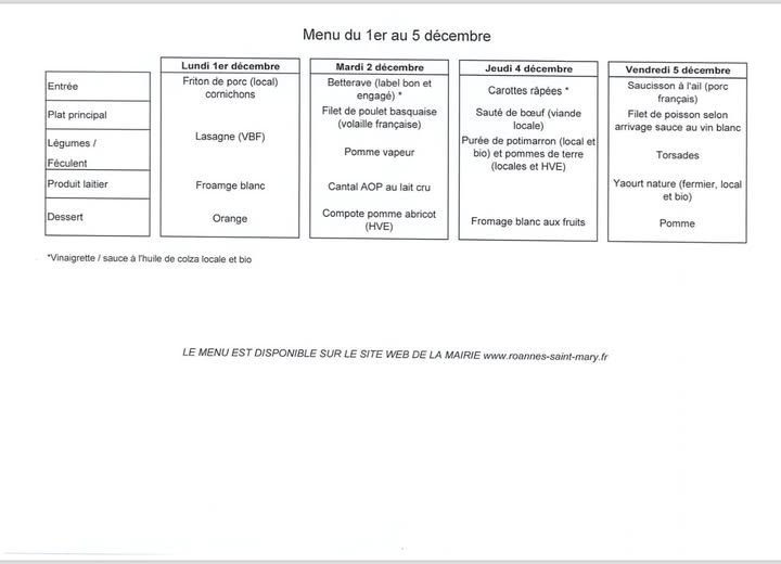 MENU DE LA CANTINE du 1 au 5 décembre 2025